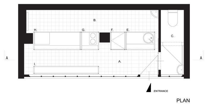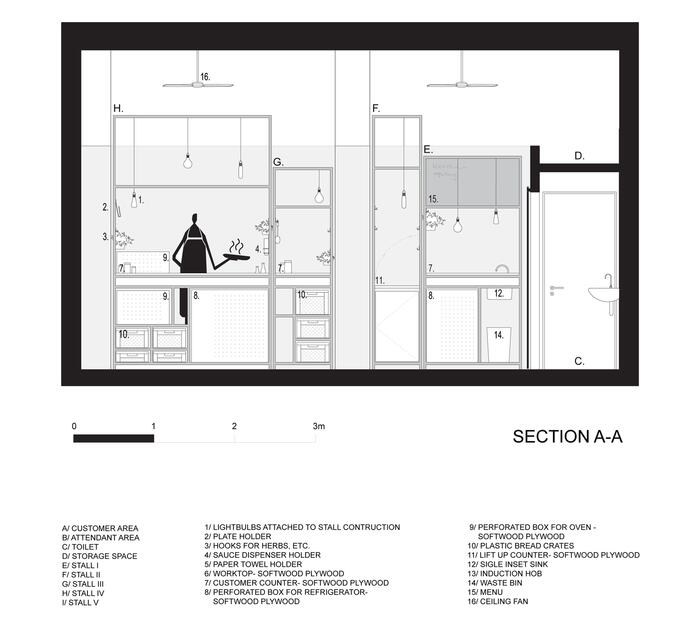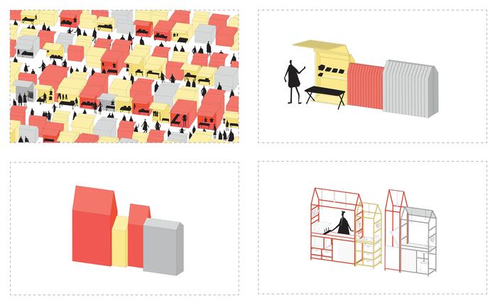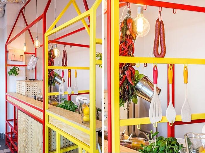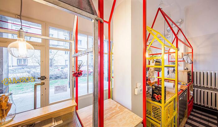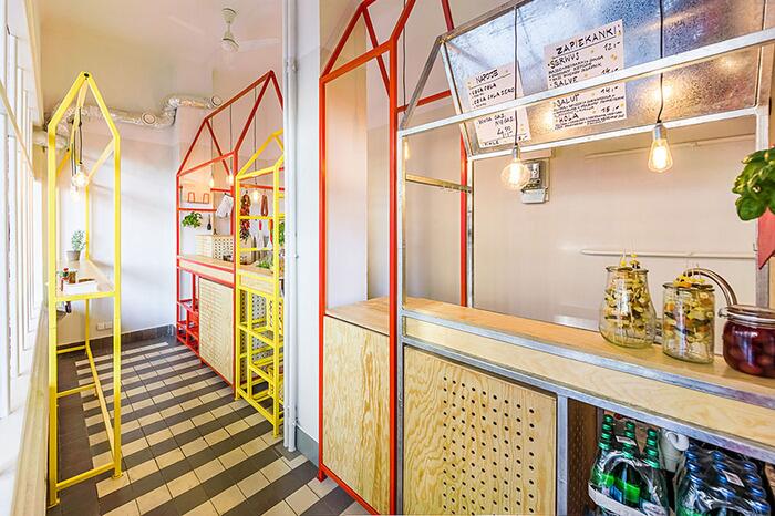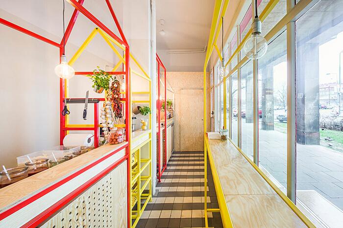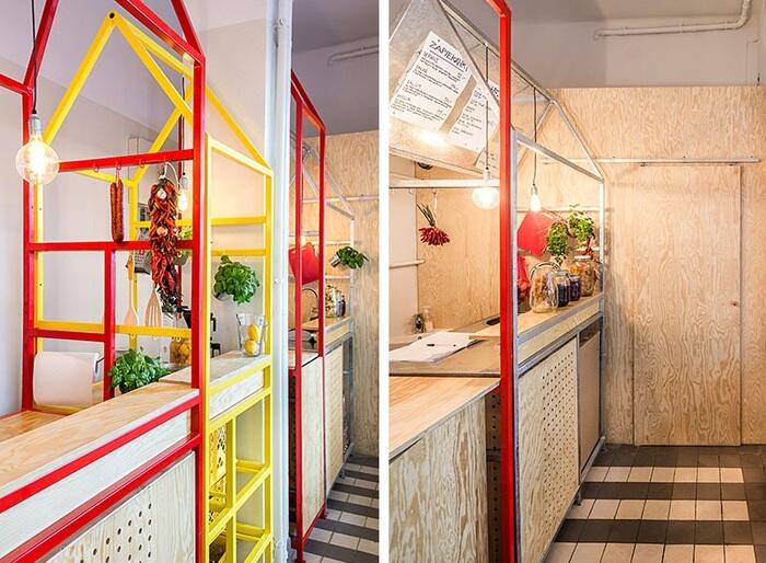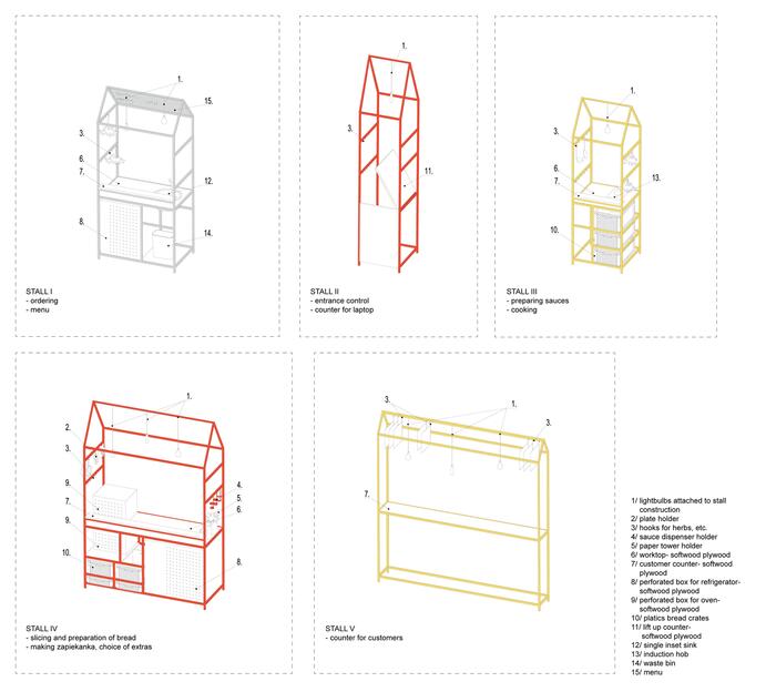 Авторы спроектировали внутри магазина пять конструкций, стилизованных под киоски, которые также напоминают очертания традиционных домов с покатыми крышами. Каждый киоск предназначен для определенного процесса приготовления zapiekanka и обслуживания клиентов. Конструкции окрашены в красные и желтые цвета сыра и кетчупа.