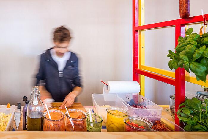 Ставшие популярными в 90-х, такие сэндвичи продавали обычно с уличных лотков, на рынках или в киосках. Собственно, образ уличной ярмарки с традиционными прилавками и стал прототипом интерьера нового заведения.