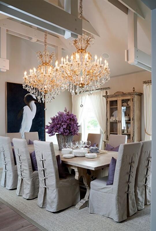 Редкая столовая обходится без массивной люстры: обычно она располагается над столом и освещает обеденную зону. Большая люстра из хрусталя или богемского стекла создает ощущение торжественности, праздничной обстановки.