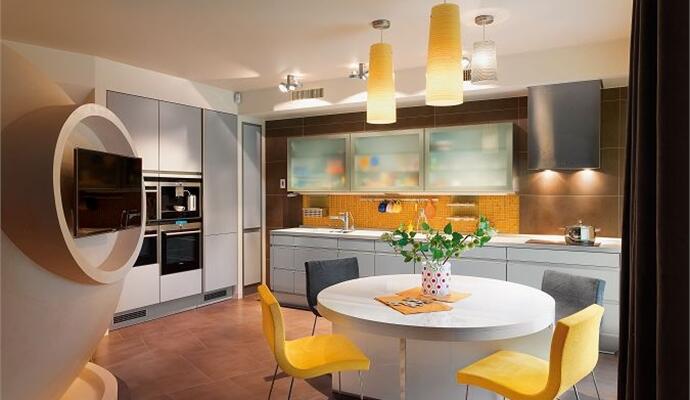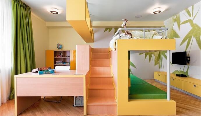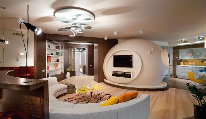 В интерьере много авторского дизайна. В прихожей ширма из бамбука имеет функциональные вставки-крючки из металла; в одной из детских на потолке можно увидеть оригинальную декорацию в виде трепетного облака из текстиля и нарисованных на стенах веселых барашков; ряд других ассоциаций и интриг скрывается в оригинальной форме светильников и мебели.