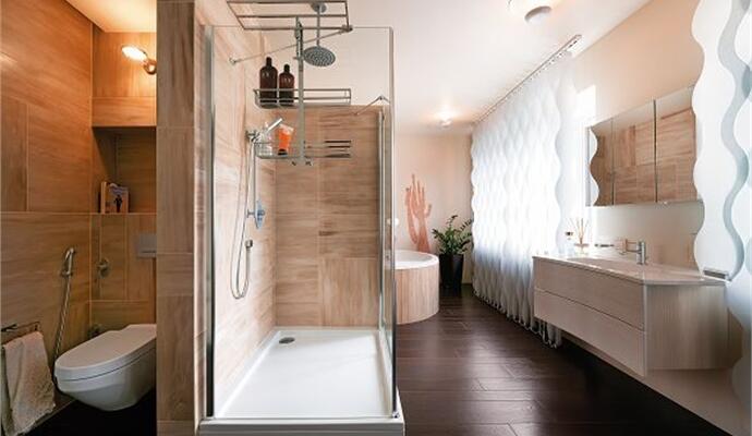 Третий «скульптурный элемент» завораживает особо. Гостевой санузел размещен прямо в студийной зоне, образуя с ней единое органичное пространство. Внешне конструкция напоминает шлем космонавта и служит стойкой под плазменные панели. Глядя на подобное чудо дизайна, возникает устойчивое ощущение, что телевизионное вещание идет прямо из головы пришельца (телепатически?). Каркас конструкции выполнен из фанеры, обтянут холстом, оштукатурен, ошлифован и проклеен по принципу папье-маше. Пара трубок на поверхности скафандра носит декоративный характер — для создания необходимого настроения они легко трансформируются в вазочки для цветов.