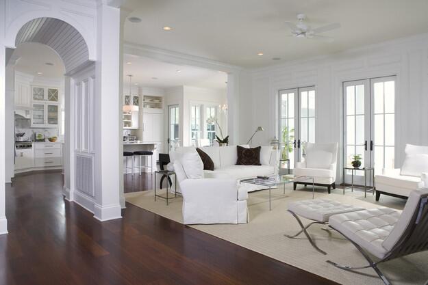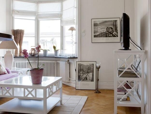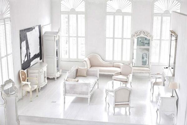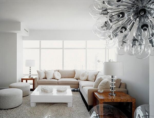 Пожалуй, самый показательный современный классический интерьер именно такой. Белый цвет лишенный фактуры, минимализм в отделке. Главную роль в таком интерьере играют детали: парные настольные лампы, декоративный камин, зеркало в массивной раме, картины на стенах, ковер с графичным рисунком, правильные четкие формы. Все эти детали создают единую атмосферу. И это действительно важно, поскольку из-за простоты отделки очень легко перешагнуть за грань с утилитарностью и тогда комната будет напоминать разворот каталога ИКЕА. Современная классика отличается своей индивидуальностью. В таком интерьере каждая мелочь подбирается очень тщательно.