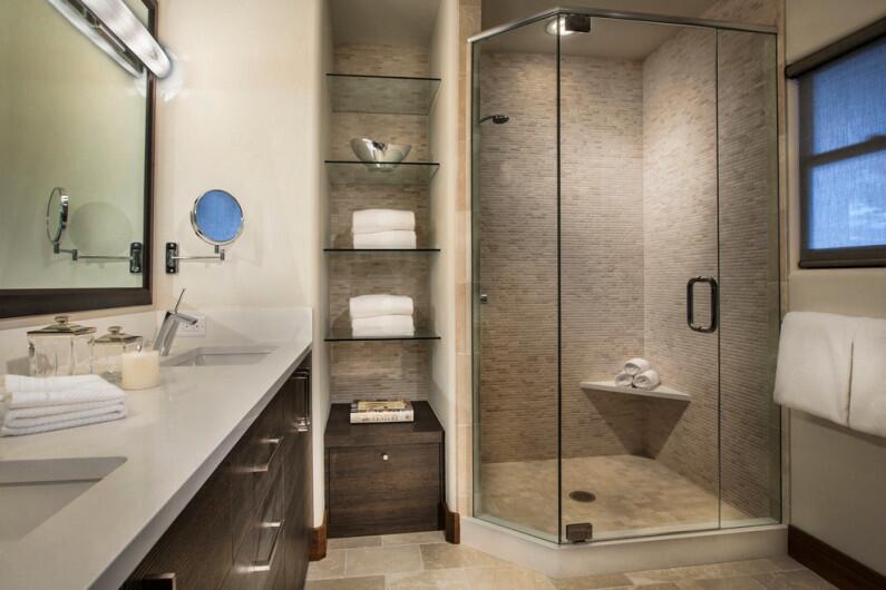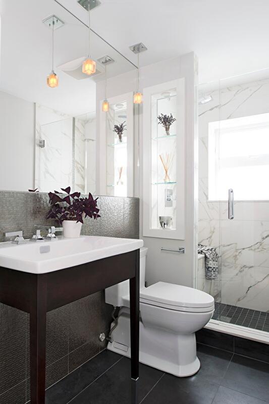 Обратите внимание на мебель со стеклянные элементами — в ванной такая приживется отлично, будет легко мыться и окажется безопасной, как экологически чистый и прочным материал.