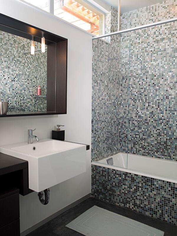 Если ванная маленькая , да еще и совмещенная с туалетом, возможно, от полноценной ванны придется отказаться в пользу кабины с матовым стеклом. В случае, когда без ванны обойтись нельзя (в доме дети или пожилые люди), позаботиться стоит о функциональной шторке и приставном устойчивом табурете.
