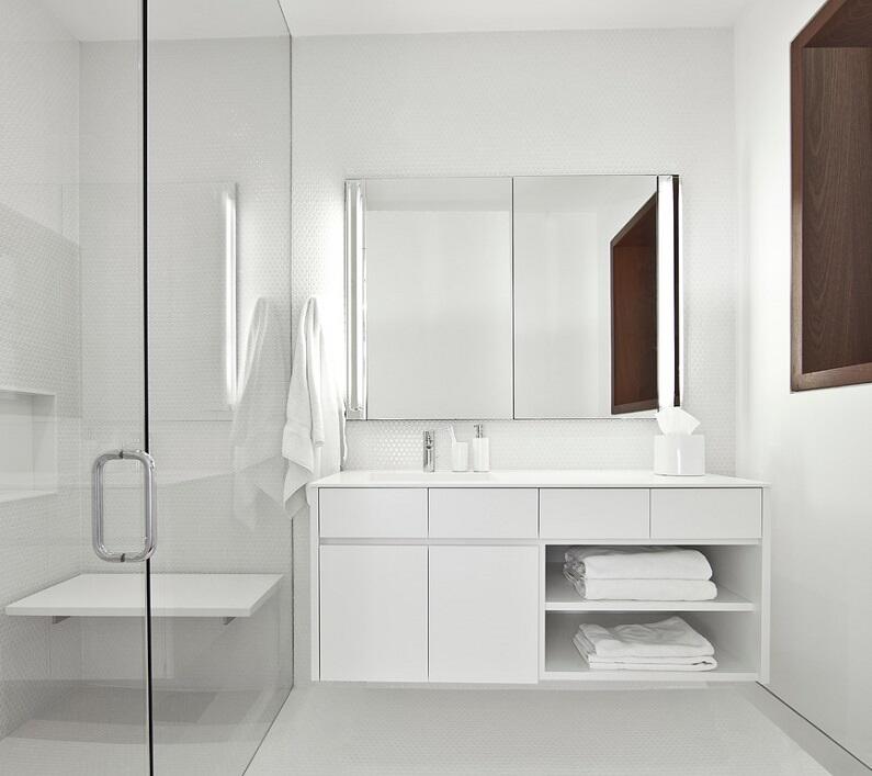 Выбирая белый или другие прохладные оттенки для оформления интерьера ванной комнаты, используйте теплый желтоватый свет в осветительных приборах. Так комната будет выглядеть более привлекательно.