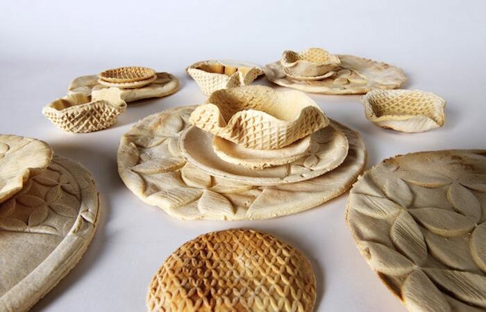 С помощью цифровых технологий поверхность одних скалок покрыта узорами, других — округлыми выемками. Комбинируя два вида скалок, можно изготовить рельефную эко-посуду, которую не придется мыть и даже можно съесть!