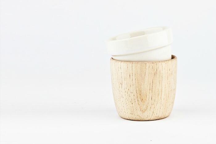 Джордж Диего Этьен (Jorge Diego Etienne ) использовал схожий принцип, воссоединив чашку с подставкой. Керамическая чашка, которая обычно быстро нагревается и обжигает руки, окружена деревянной подставкой-держателем.