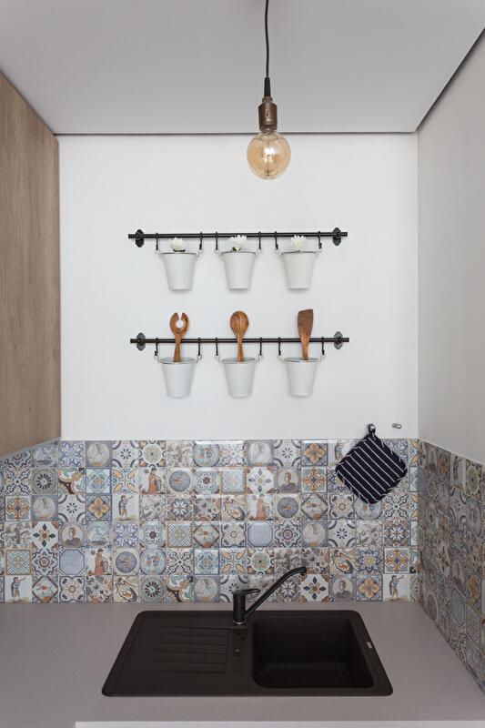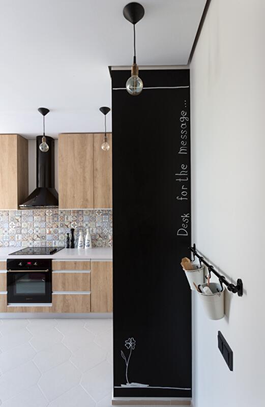 Игровыми элементами в интерьере стали меловая доска и декоративная стенка с крючками и вешалками для одежды и аксессуаров.