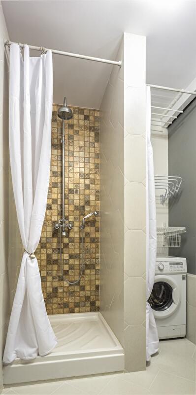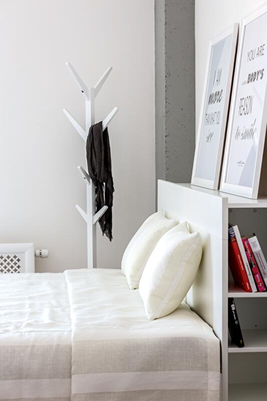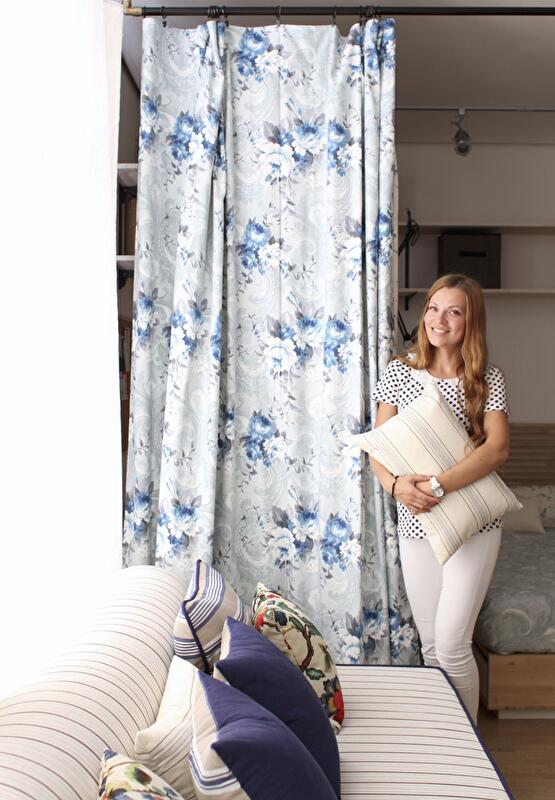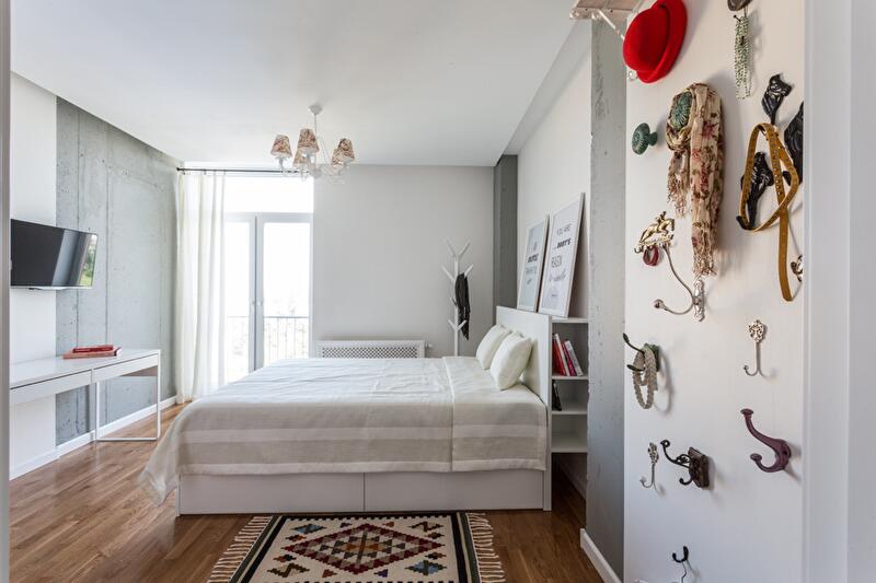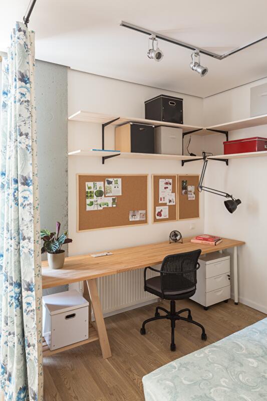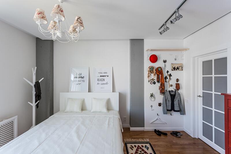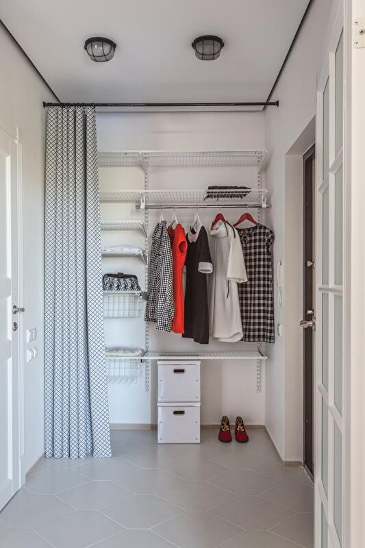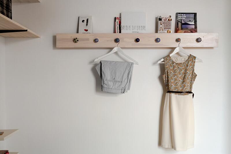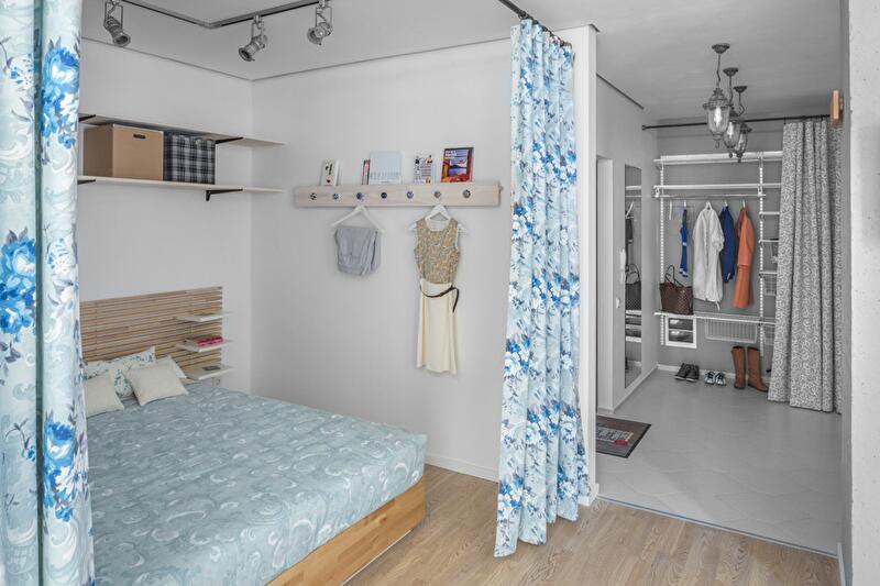 Спальную зону отгородили плотной шторой – таким образом трансформация открытого пространства решается «легким движением руки» (открывая или закрывая «занавес»). Вход в квартиру и гардероб освободили от лишних углов и громоздких шкафов. Подобным образом поступили и с оставшейся частью пространства квартиры – задачу хранения вещей решили за счет легких открытых полок, ящиков под кроватью, мобильной конструкции гардеробной зоны.
