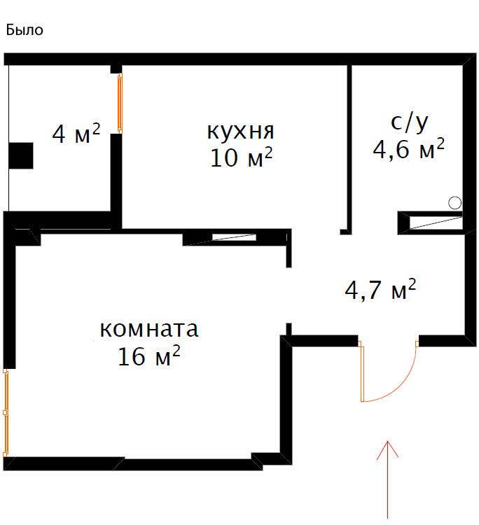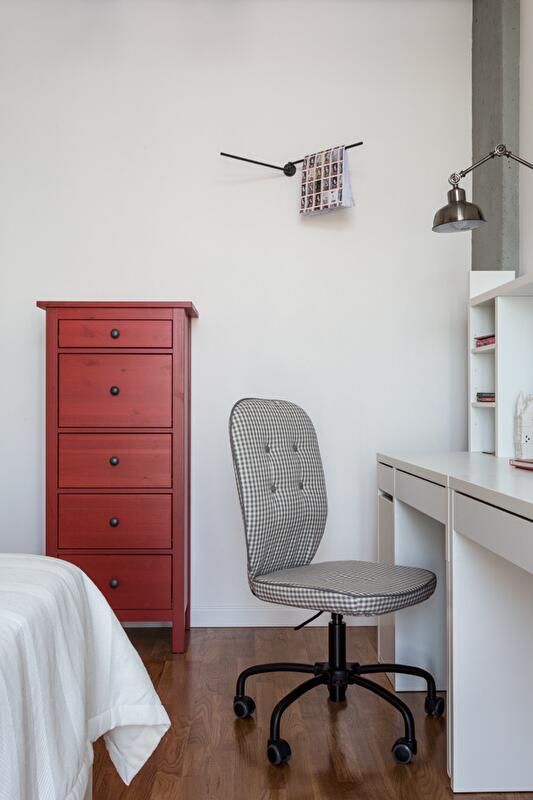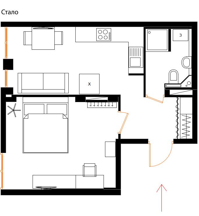 В планировке этой квартиры приоритетной стала уединенная комната с дверью, разделяющей пространство на гостевое и уединенное. Зону спальни и рабочего места поместили в «уединение», убрав при этом дверь между кухней и прихожей (вместо них оставили высокий проем). Таким образом высвободилось достаточно места для небольшой гостиной-столовой и зоны кухни.