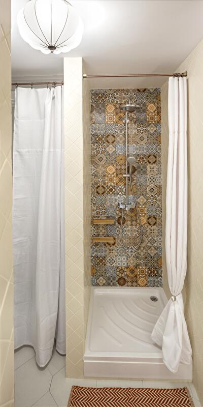 Так как квартира находится на северной стороне, сохранить ощущение светлого пространства удалось за счет преобладания белого цвета стены, штор, мебели, текстиля и плитки). Чтобы расширить достаточное вытянутое пространство зоны гостиной и кухни, подобрали плитку в форме усеченного ромба.