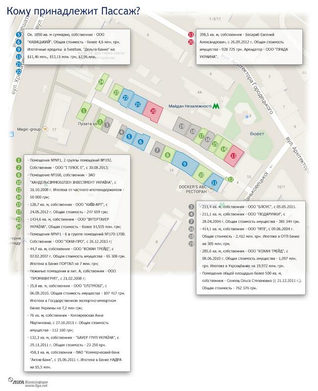 Выписка из реестра по этому адресу - 50-страничный документ о владельцах более чем двух десятков помещений. Бо льшая часть данных информационной справки, полученной из реестра, довольно хаотична: фигурируют формулировки вроде "прочие нежилые помещения в Лит. А" без указания более точных координат расположения и даже площади помещений, не везде есть данные о стоимости имущества и записи об ипотеке. Но журналисту Л ІГАБізнесІнформ удалось почти полностью разгадать этот ребус и составить мини-рейтинг владельцев недвижимости в Пассаже. ![]()