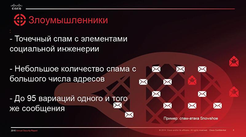 За последний год активизировался трудно поддающийся обнаружению "спам на снегоступах", когда злоумышленники рассылают спам небольшими порциями (3-5 писем) с большого количества IP-адресов, что позволяет успешно избегать обнаружения. "Объем спама создается за счет использования сотен тысяч компьютеров. Причем содержание письма меняется по смыслу – каждое письмо немного отличается от предыдущего. Таким образом нагрузка распределяется на множество зараженных компьютеров", – объясняет эксперт.