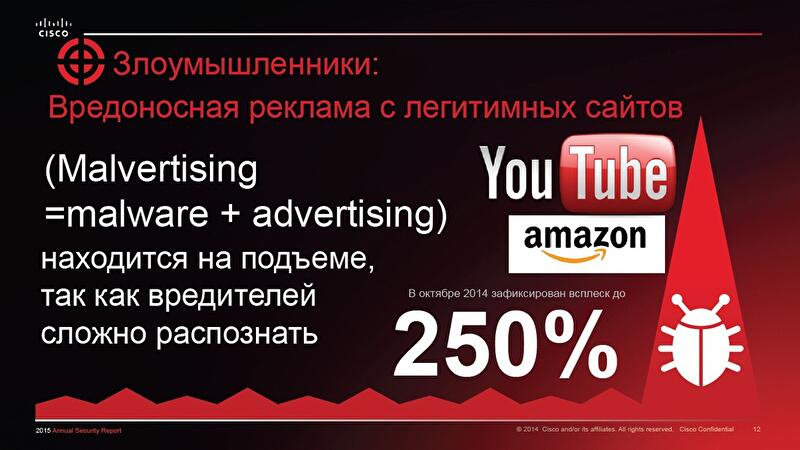 На деле специалисты Cisco обнаружили зараженные баннеры на таких всемирно известных сайтах, как Amazon и YouTube. "Есть очень большое количество украинских сайтов, которые были скомпрометированы. Скорее всего, через них существует очень большая вероятность получить заражение, через баннерные ссылки в том числе", – говорит Алексей Бессараб, технический директор Cisco Ukraine.