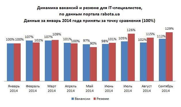 По данным портала rabota.ua, количество вакансий для ИT-специалистов в сентябре 2014 года выросло на 10% по сравнению с августом 2014 года и на 12% по сравнению с январем. Количество резюме также показывает положительную динамику, причем последние три месяца динамика роста просто бурная – например, прирост сентября 2014 года относительно января 2014 года составляет почти 30%.
