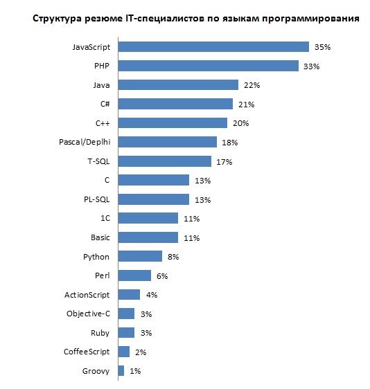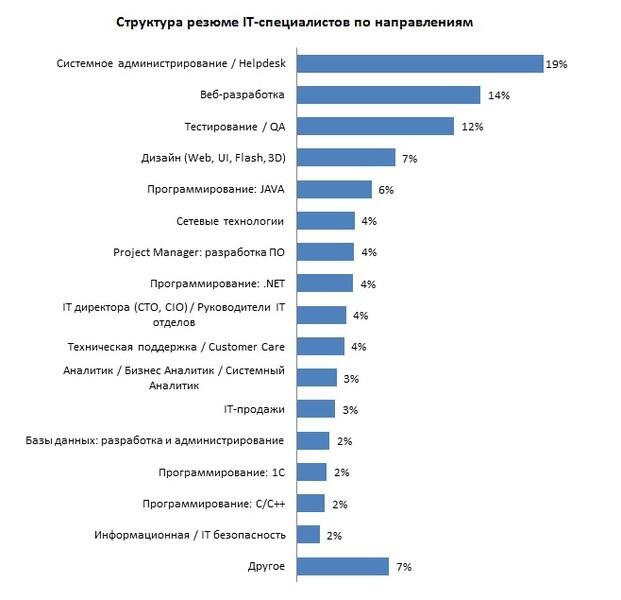 Самое большое количество резюме в IT от системных администраторов (19%), веб-разработчиков (14%) и тестировщиков (9%). Неудивительно, ведь системные администраторы являются самыми универсальными специалистами отрасли.