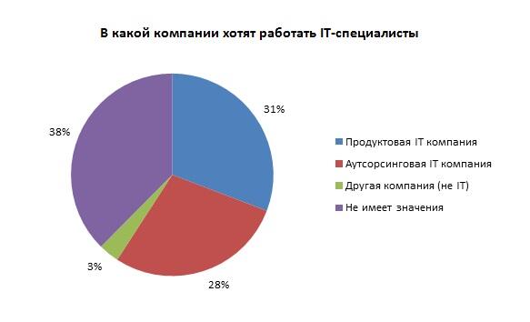Для большинства IT-специалистов (38%) не имеет значения, в какой IT- компании работать – продуктовой или аутсорсинговой. Тем не менее, 31% специалистов IT-сферы предпочли бы работу в продуктовой компании – против 28%, желающих работать в аутсорсинговой компании. И только 3% готовы перейти в другую сферу (не IT).