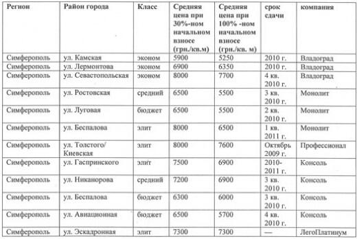 Мониторинг цен на первичном рынке недвижимости Крыма на 28 февраля 2010 г.
