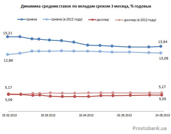 По исследованию компании «Простобанк Консалтинг», наибольшей динамикой по итогам весны-2013 отметились трехмесячные вклады в гривне: по ним среднерыночная ставка упала на 1,3 процентного пункта. При этом доходность вкладов в гривне от банков из числа 50-ти лидеров по активам была выше, чем в аналогичный период прошлого года. Долларовые вклады сохранили стабильность, почти не изменившись как за три месяца весны-2013, так и с весны прошлого года.
