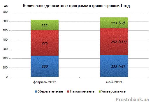 Несмотря на снижение ставок, предложение депозитов весной-2013 немного выросло. Больше всего увеличилось число накопительных программ – с возможностью пополнения и без права частичного снятия. По сроку один год их стало 292 вместо 275-ти.