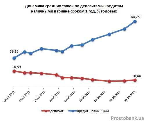 Удешевление для банков денежного ресурса в виде гривневых вкладов не оказало влияния на стоимость кредитов наличными. Даже наоборот: за март-май-2013 средние реальные ставки по займам сроком на год от банков из числа 50-ти лидеров по активам выросли на 2,8 процентного пункта.