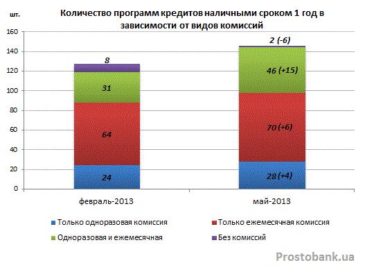 По исследованию компании «Простобанк Консалтинг», к концу весны-2013 на рынке осталось всего две программы кредитов наличными без комиссий – это вчетверо меньше, чем было в конце февраля-2013. Но в полтора раза выросло число предложений, предполагающих как одноразовую, так и ежемесячную комиссию: вместо 31-й их стало 46.