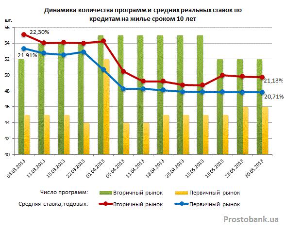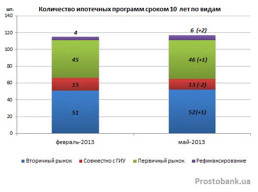 Количество ипотечных программ от банков из числа 50-ти лидеров по активам за весенние месяцы-2013 также немного подросло. По исследованию компании «Простобанк Консалтинг», по разным типам кредитов добавилось всего по 1-2 программы. Исключением стали займы с рефинансированием в ГИУ – их предложение сократилось на две программы.