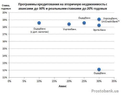 Что касается программ кредитования на жилье с авансом до 30% и реальными ставками до 20% годовых, то их предложение весной-2013 немного сократилось и осталось шесть против семи в феврале-2013. Из них три по-прежнему предлагает Ощадбанк. Он же лидирует по показателям «минимальный аванс» и «минимальная реальная ставка».