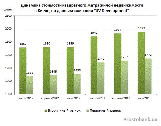 Цены на недвижимость в Киеве за три весенних месяца подросли: в среднем на 1,8% для вторичного жилья и на 1,7% для нового. При этом первичная недвижимость остается в среднем на 10,5% дешевле жилья на вторичном рынке, и эта разница сокращается: год назад она оставляла 11,5%. К слову, за весну-2012 цены на вторичное жилье почти не изменились, а «первичка» подорожала меньше – на 1,1% за три месяца.