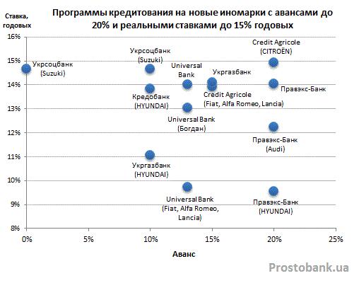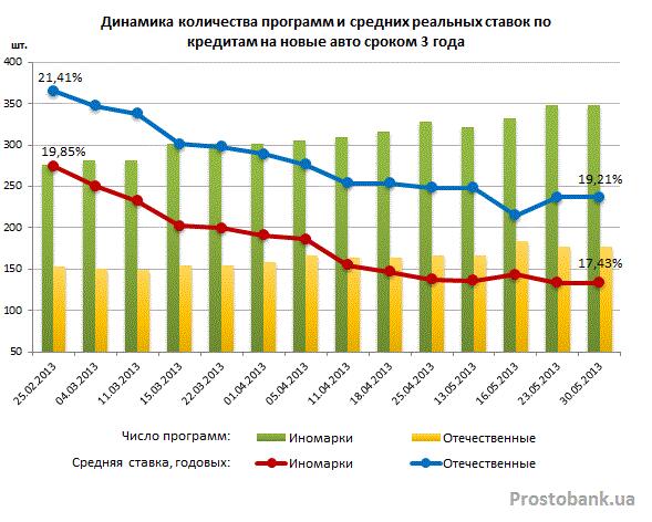 По исследованию компании «Простобанк Консалтинг», кредиты на новую иномарку с авансом до 20% ее стоимости и реальной ставкой в пределах 15% годовых в конце мая-2013 предлагают шесть банков из числа 50-ти лидеров по активам в виде 13-ти кредитных программ. Из них только три программы не относятся к партнерским предложениям с автосалонами или производителями.