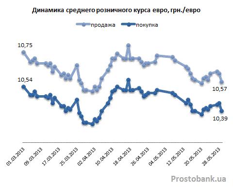 По исследованию компании «Простобанк Консалтинг», за три месяца весны-2013 доллар подорожал в среднем по рынку на 1-2 копейки, как по курсу продажи, так и по курсу покупки. Заметнее изменился курс евро: эта валюта по итогам трех месяцев подешевела в среднем на 1,5%.