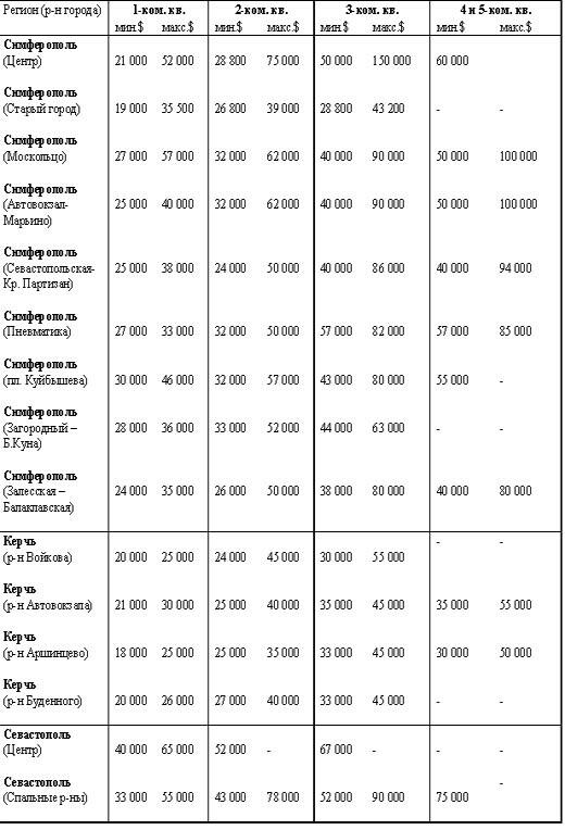 Согласно данным крымских агентств недвижимости, переданным в агентство е-Крым, по состоянию на 31 мая в регионах Крыма действуют следующие цены на вторичное жилье: