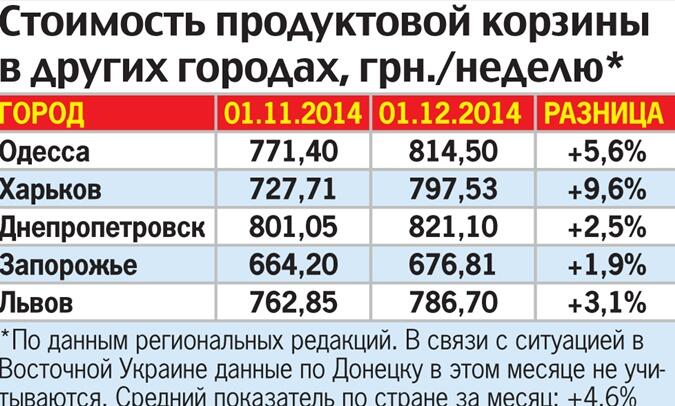 Практически на среднестатистическом уровне выросли цены в Киеве - плюс 4,7%. Это притом, что в прошлом месяце стоимость нашей продуктовой корзинки выросла на 5,6%, а перед этим - на 4,5%. Сезонное подорожание многих продуктов накладывается на выросший курс да плюс еще новогодние праздники не за горами… Все эти факторы без устали гонят цены вверх.