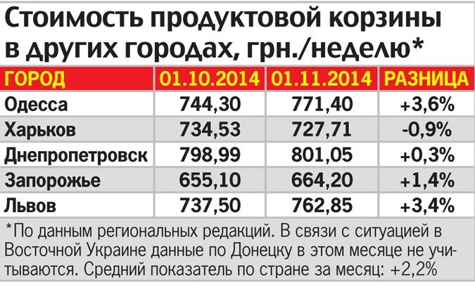Единственным регионом, где цены по итогам октября снизились, стал Харьков, в котором, напомним, в сентябре наша корзина подорожала на 5,2 процента. В местных супермаркетах подорожали сметана, мука, куриное филе, сыр, колбаса, овощи. В то же время немного снизились цены на сахар, крупы, картофель, подсолнечное масло, благодаря чему стоимость подсчитанного нами продуктового набора снизилась на 7 грн.