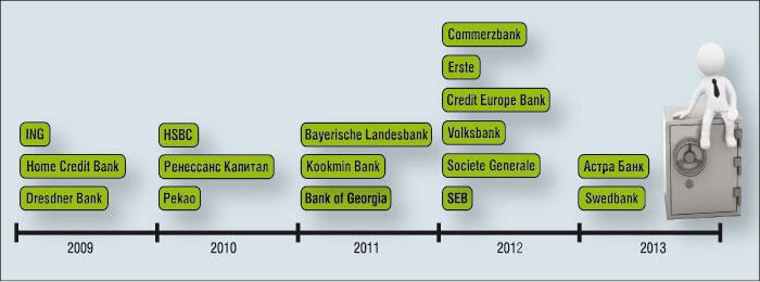 Но с началом кризиса праздник закончился. Уже осенью 2008-го украинские «дочки» из наиболее прибыльных подразделений международных финансово-банковских групп превращаются в loss making business. Они, как выражаются дилеры, «поймали лосей». Мало того, что у банков исчезла возможность получать прежние объемы прибыли, так еще и полная остановка кредитования, совпавшая с девальвацией гривни более чем на 60%, и бегство вкладчиков привели к резкому ухудшению качества кредитных портфелей. Только по официальным данным НБУ, просроченные кредиты в 2008-м выросли до 18,02 млрд грн по сравнению с 6,36 млрд грн годом ранее, а по оценкам независимых агентств, эти цифры были на порядок больше. Отрицательный финансовый результат украинских банков в 2009 году составил 38,5 млрд грн.