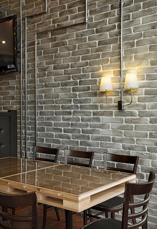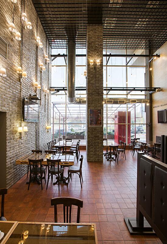Кирпичная стена с грубой побелкой не вызывает особого восхищения на улице, но внутри здания смотрится довольно эффектно. Этим принципом очень удачно воспользовалась студия A-partmentdesign при оформлении кафе развлекательного комплекса City Entertainment в Николаеве.