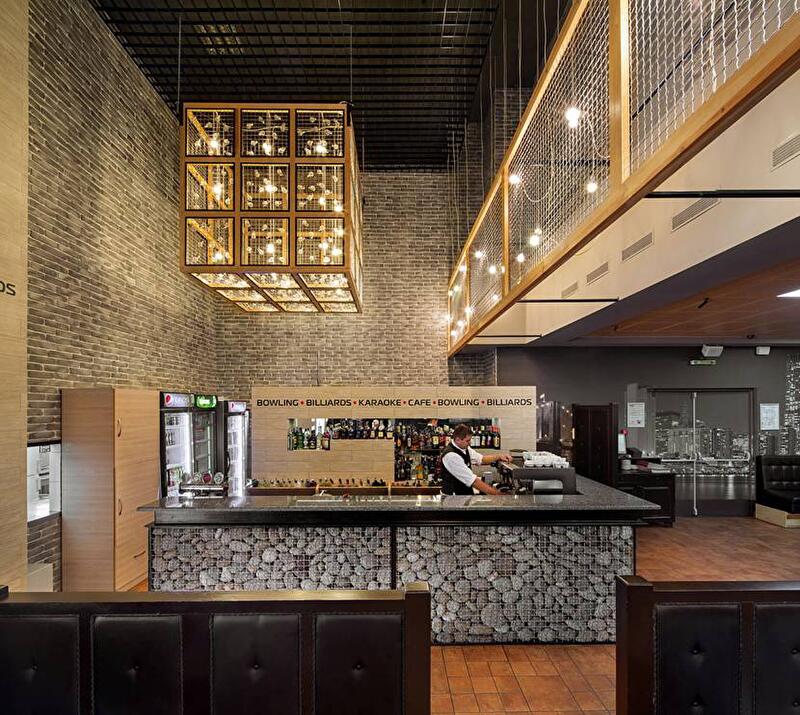 Световой сценарий помещения выполнен тоже в лучших традициях урбанистического стиля: бра, расположенные по всей высоте стен, напоминают уличные фонари. Отдельного внимания заслуживает освещение барной стойки. Куб, подвешенный над ней, в первоначальном варианте должен был поддерживать общую стилистику внутренних перегородок, отделяющих зону кафе от бильярдной, и служить осветительным прибором для рабочей зоны бармена. Однако вскоре стал самодостаточным декоративным элементом и не только выполняет утилитарные функции, но и отдаленно напоминает светящиеся окна ночного города.