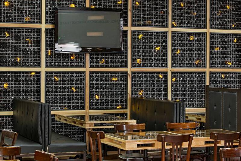 Так, стены были декорированы под кирпич, что идеально гармонирует с оформлением внутренних перегородок помещения. Основой последних служит металлическая решетка, за которой собраны тысячи стеклянных бутылок. Тему деревянной обрешетки этих перегородок решили продолжить такими же натуральными деревянными стеновыми панелями напротив.