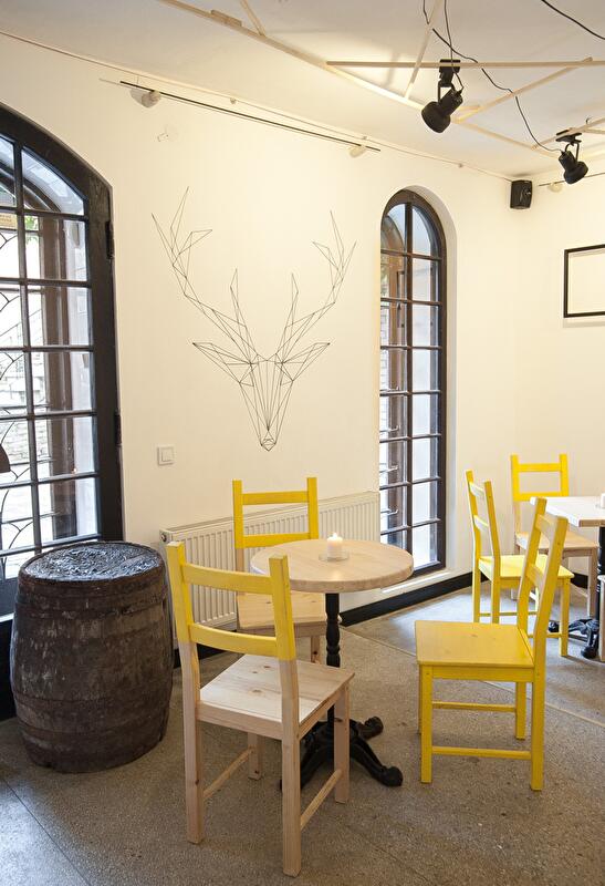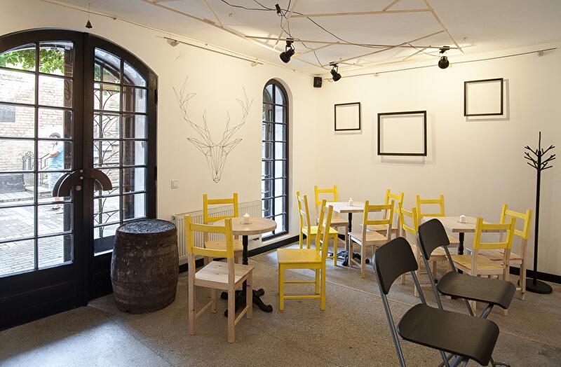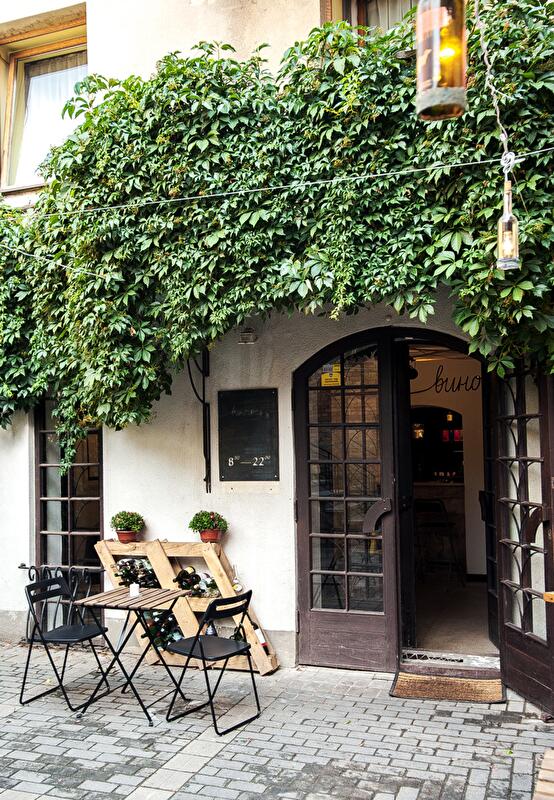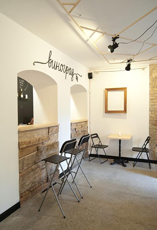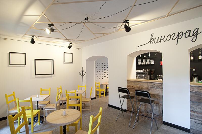 Кафе «Виноград» общей площадью 55 м2 разместилось в помещении бывшей местной художественной галереи в старой части города. Свое название заведение получило из-за густых изумрудных зарослей винограда, которые облетают внутренний дворик кафе.