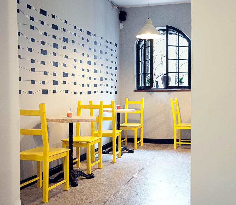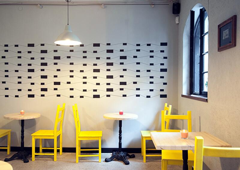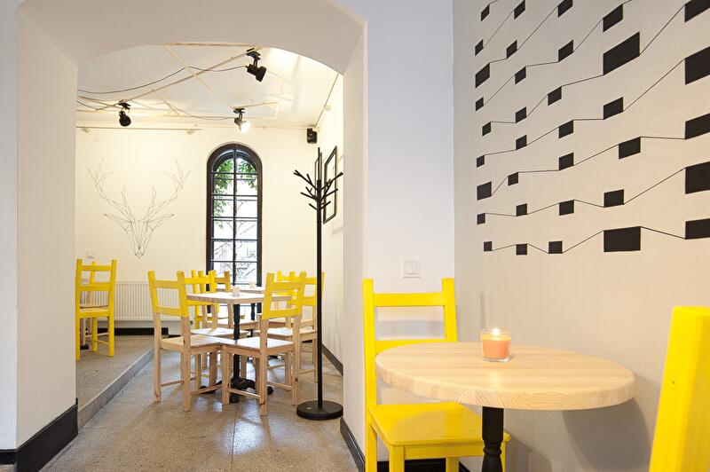 Интерьер помещения, выполненный в минималистском стиле, разбавляют яркие деревянные стулья со спинками желтого цвета и аккуратные столики на черных, декорированных резьбой ножках.