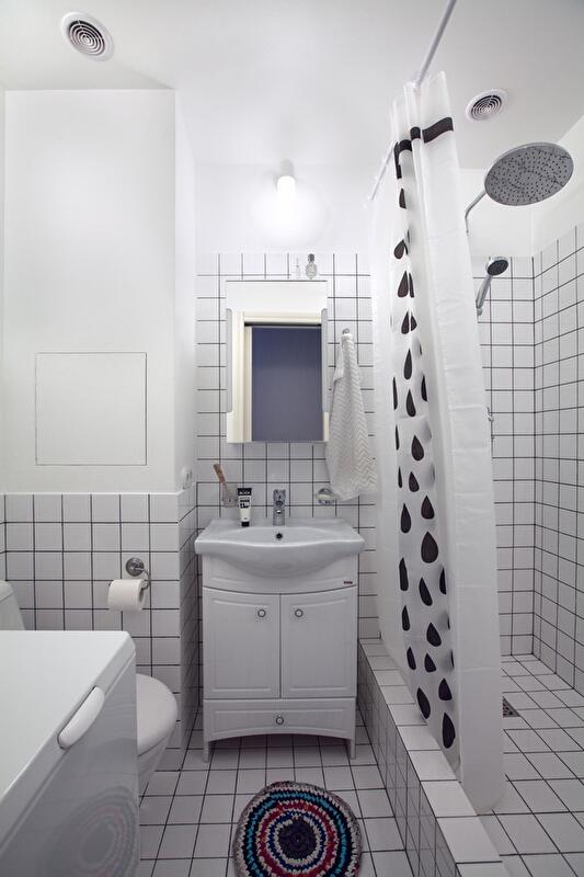 В гостиной поселились дружелюбные зеленые кресла и удобный серый диван. Санузел оставили белым.