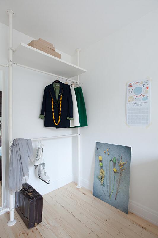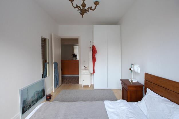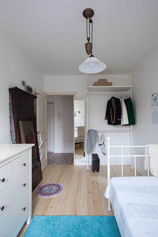 В кухне мы решили не делать высоких навесных шкафов – хотелось больше легкости и воздуха. Но, с другой стороны, совсем без них было не обойтись, так как кухня весьма компактная. В спальне поставили вместительный платяной шкаф, а еще в одной комнате к уже имевшемуся комоду добавили открытую стеллажную систему из ИКЕА.