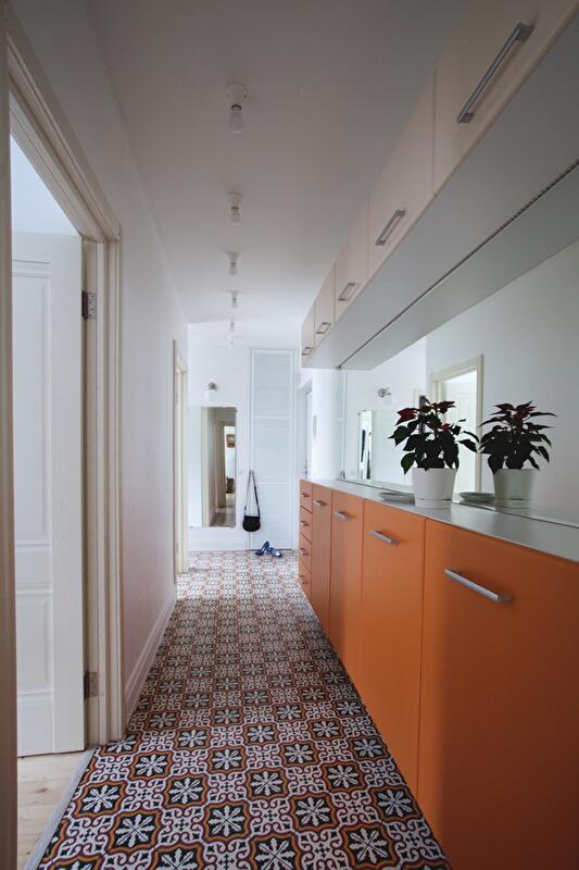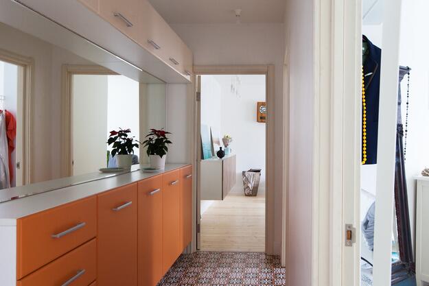Основой колорита проекта стал белый. В прихожей заказчице захотелось добавить солнца и яркости, таким образом здесь появился сочный апельсиновый цвет в фасадах навесных полок. Кухня должна была принять старый деревянный стол, массивный и основательный. И чтобы визуально разгрузить пространство, мы решили остановиться на гладких белых матовых фасадах с «цементной» столешницей. Получилось легко.