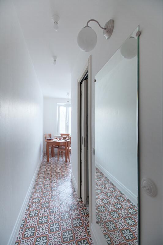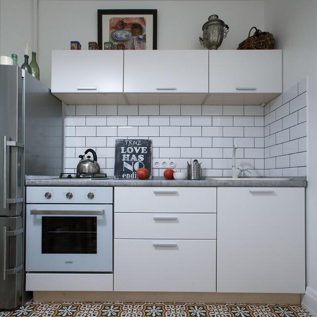 В прихожей и на кухне на полу лежит узорная испанская керамическая плитка. Санузел облицован плиткой из Леруа Мерлен, там же мы нашли и плитку на кухонный фартук.