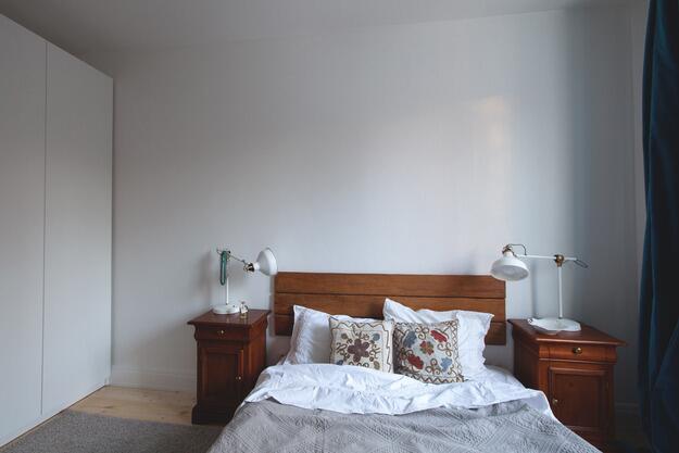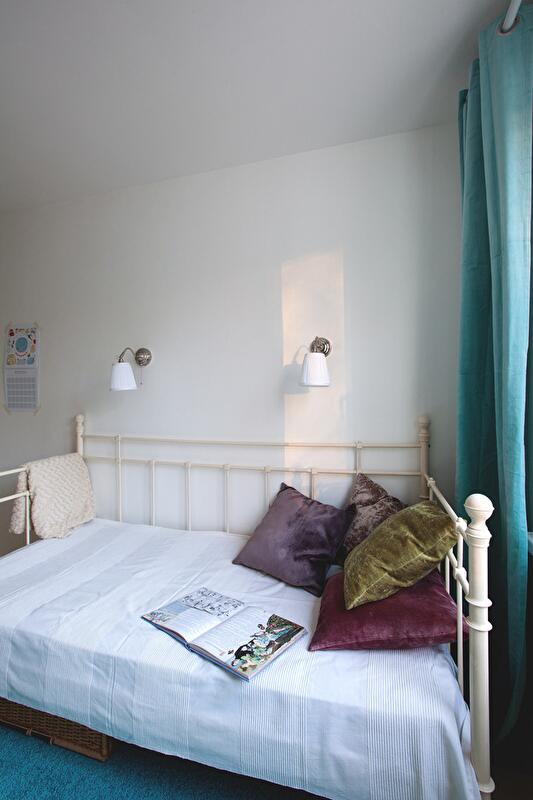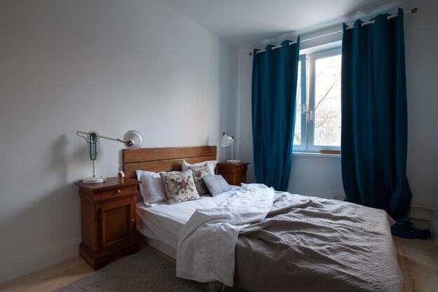 В комнате мы добавили голубой, он освежает и оживляет пространство. В спальне у нас были прикроватные тумбы и изголовье кровати, переделанное из спинки кухонной скамейки, довольно насыщенного красно-коричневого цвета. К ним мы добавили густые ночные шторы и мягкий бежевый текстиль.