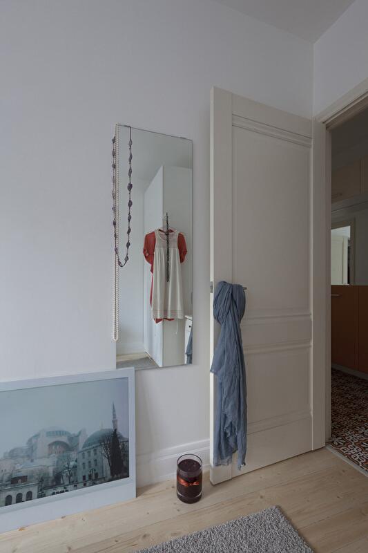 В прихожей была небольшая кладовка, в которой хранился всякий скарб. Ее мы демонтировали, и в освободившемся пространстве разместили штанги для верхней одежды. Это дало нам возможность обойтись без массивных шкафов в основном коридоре: вместо них мы повесили там полки и огромное зеркало, которое добавило и света, и пространства.