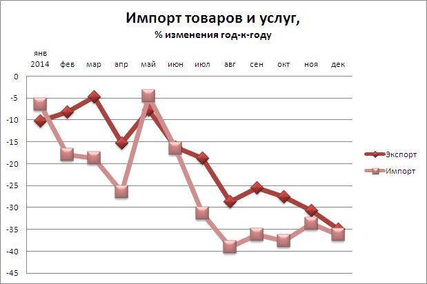 Почему же так затянулся "поиск равновесного курса"? Ответ на этот вопрос каждый желающий может найти в статистике экспорта из Украины, публикуемой Национальным банком. Если в первом полугодии 2014-го падение украинского экспорта составляло около 10%, то после удара войны по экспортному потенциалу оно существенно усилилось. Осенью падение украинского экспорта составляло уже 25-30%. К сожалению, в это время многие в Украине, руководствуясь неполными данными "вчерашнего дня" и временным статистическим эффектом роста поставок в ЕС , вместо принятия реальности поспешили объявить победу над дефицитом торгового баланса, хотя ситуация на самом деле ухудшалась. Дополнительным ударом по нашему экспорту стал мощный виток падения цен на сырьевые товары в последние месяцы . В итоге в декабре 2014 года падение экспорта достигло 35% и практически сравнялось с падением импорта.