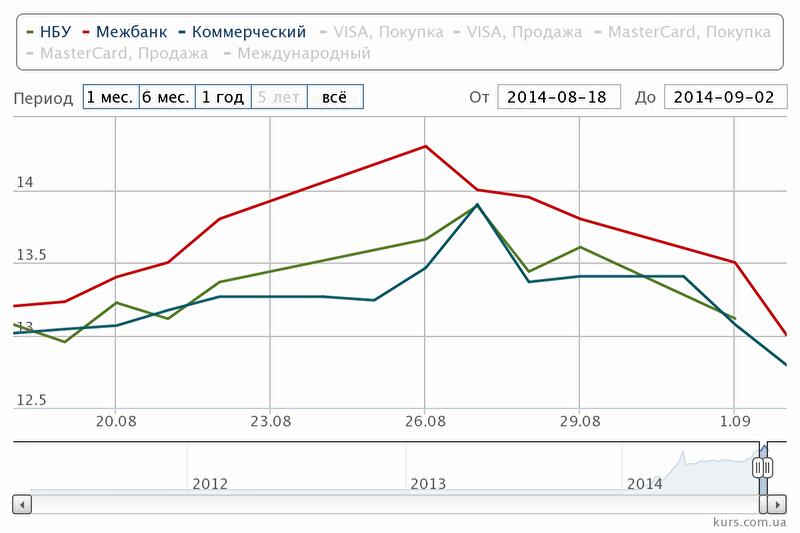 Как известно, первый августовский рекорд падения гривни был установлен 12 числа – тогда доллар на межбанке достиг 13,6 грн. После этого курс "зеленой валюты" откатывался в течение двух дней и стабилизировался в районе 13,1 грн. Но с 20 августа гривня вновь ушла в пике, и уже 26-го в ходе торгов на межбанковском рынке был обновлен исторический минимум курса нацвалюты - котировки достигли 14,30-14,7 грн/долл.