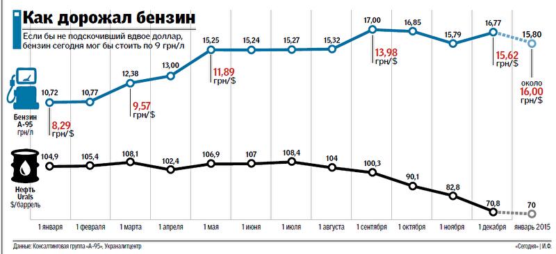 Если бы в Украине не было таких скачков курса — цена бы снизилась значительней. Ведь, по расчетам эксперта, 80% нефтепродуктов импортируется и только 20% производится в Украине, а значит, трейдеры закупают топливо в долларах, а продают в гривнях. Но курс доллара к гривне, как известно, вырос с начала года почти вдвое (с 8,29 грн/$ до 15,62 грн/$, или на 88%. — Авт.), поэтому в гривнях "горючка" стала дороже на 60%, или на 6 грн/л.
