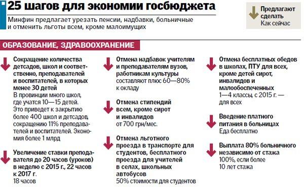 Пугают дефолтом. По словам президента Украналитцентра Александра Охрименко, при формировании бюджета-2015 главный удар примут на себя образование, здравоохранение и пенсионеры: "Бесплатные учебники и обеды в школах, бесплатную медицину могут ликвидировать. Отсутствие экономии расходов бюджета и реформ может привести к дефолту".